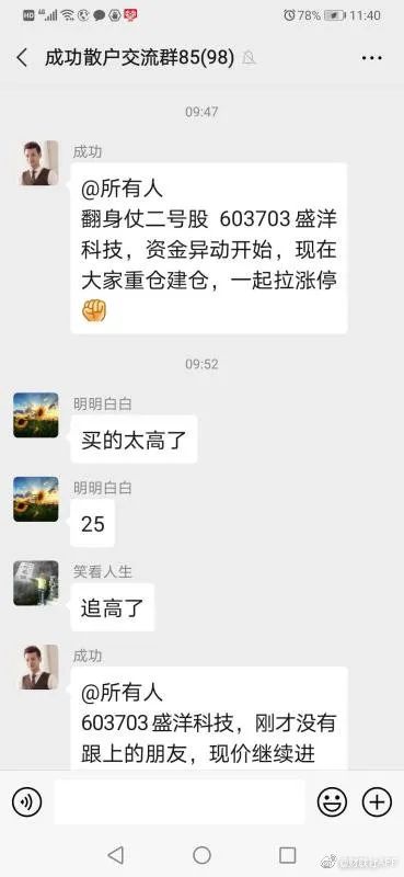 此事引发巨大关注,这家A股公司叫盛洋科技,竟然有庄家明目张胆在微信群忽悠散户接盘。