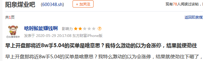 5月29日9:30分,随着A股开盘,阳泉煤业的故事却急转直下,同时也创下了1分钟的天量成交。阳泉煤业开盘4.68元,但一分钟K线图显示,公司股价瞬间达到5.04元,因为时间太快以至于分时图并未显示出该上冲迹象。仅1分钟时间,阳泉煤业成交额达到6890万元,成交量达到14.02万手,前5分钟成交额为1.01亿元,到9:35时股价也降至4.55元,跌2.57%;9:48时股价降至全天最低点4.49元,之后全天基本维持在4.5元附近徘徊;5月29日全天报收4.54元,跌2.78%,全天成交额2.58亿元。