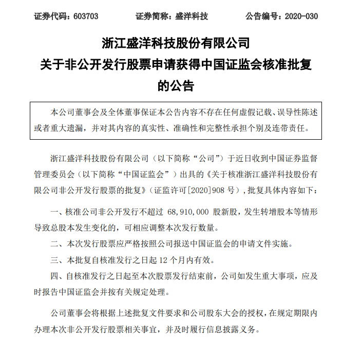 另外,盛洋科技6月3日晚间公告,公司近日收到证监会批复,核准公司非公开发行不超过6891万股新股。该批复自核准发行之日起12个月内有效。