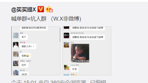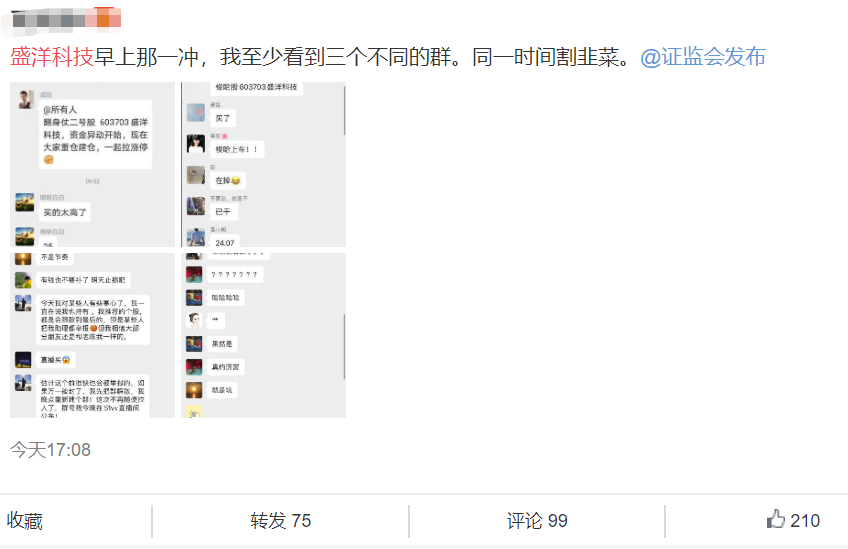 在盛洋科技跌停收盘之后,就有微博大V曝光有炒股微信群忽悠散户接盘。