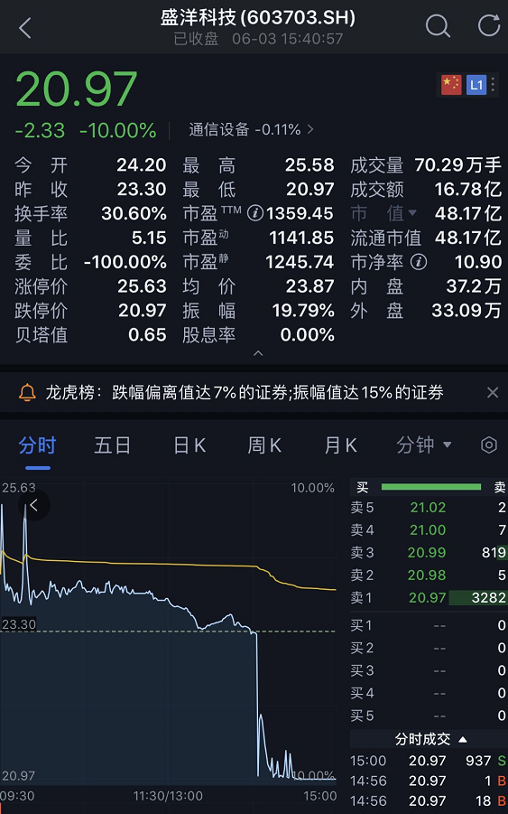 A股公司盛洋科技,在3日开盘之后,成交量突然放大,两次冲击涨停但均失败了,知道午后接近收盘的时候,突然闪崩跌停,股价从最高25.58元/股跌到20.97元/股,跌幅最高达18%。