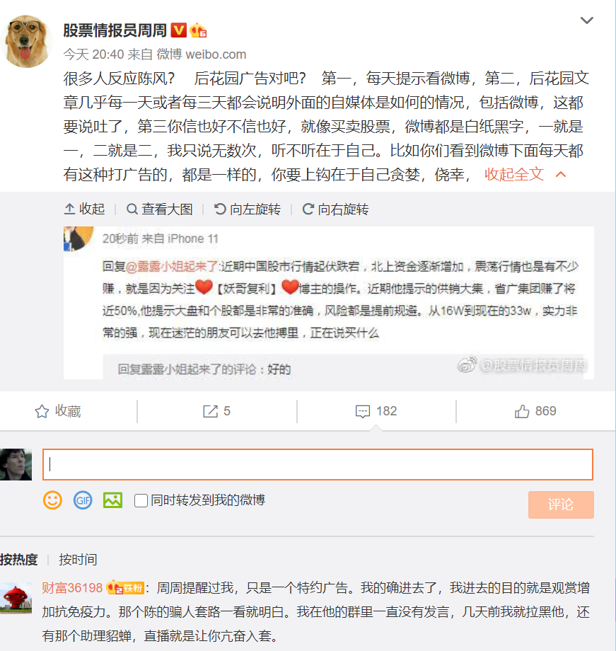 基金君前往这个博主一看,原来是当初他发的一条广告,一堆忠实粉丝信了这个博主的话,加了这个叫陈风的荐股群,于是被割了韭菜,而微博博主“股票情报员周周”已经在为当初发的广告撇清关系了。