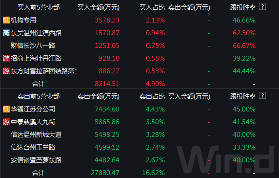 盘后数据显示,全天换手率为30.60%,成交额为16.78亿元。从资金流向和龙虎榜可以看出,个股超大单和大单资金大幅卖出,而中单和小单资金买入较多。龙虎榜上1家机构资金大幅买入,却没有卖出。