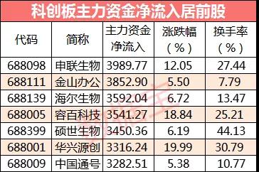资金流向方面,今日主力资金净流入的科创板股共有50只,其中,7只个股主力资金净流入超3000万元,申联生物主力资金净流入3989.77万元,净流入资金居首;金山办公、海尔生物紧随其后,全天净流入资金分别为3852.90万元、3592.04万元。