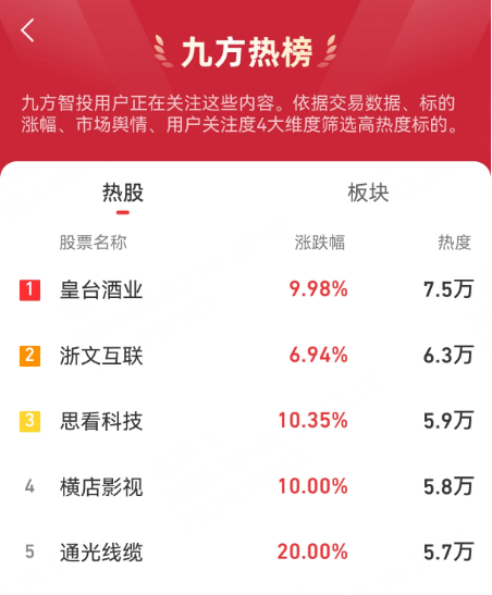 九方热榜:皇台酒业,浙文互联,思看科技,横店影视,通光线缆