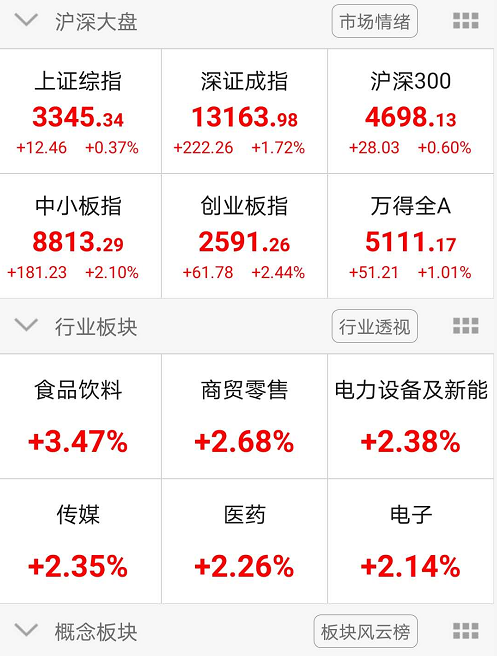 截至收盘,上证指数仅上涨12.46点,小幅上涨0.37%,深证成指上涨1.72%,创业板指盘中一度暴涨超过4%,尽管尾盘回落,但收盘仍上涨2.44%。