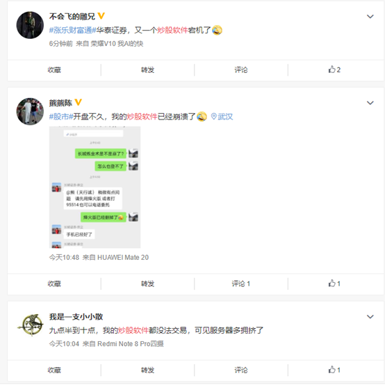 而今天两市成交量进一步放大,又有不少网友反映炒股软件宕机的情况,从网友和投资者吐槽对象来看,涵盖多家券商。