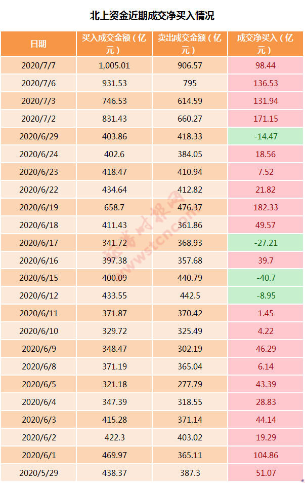 数据显示,7月7日,陆股通资金再次净买入98.44亿元,逼近100亿元,在此之前,北上陆股通资金连续3个交易日净买入超过100亿元。值得注意的是,这几个交易日正好对应A股市场暴力拉升的阶段。