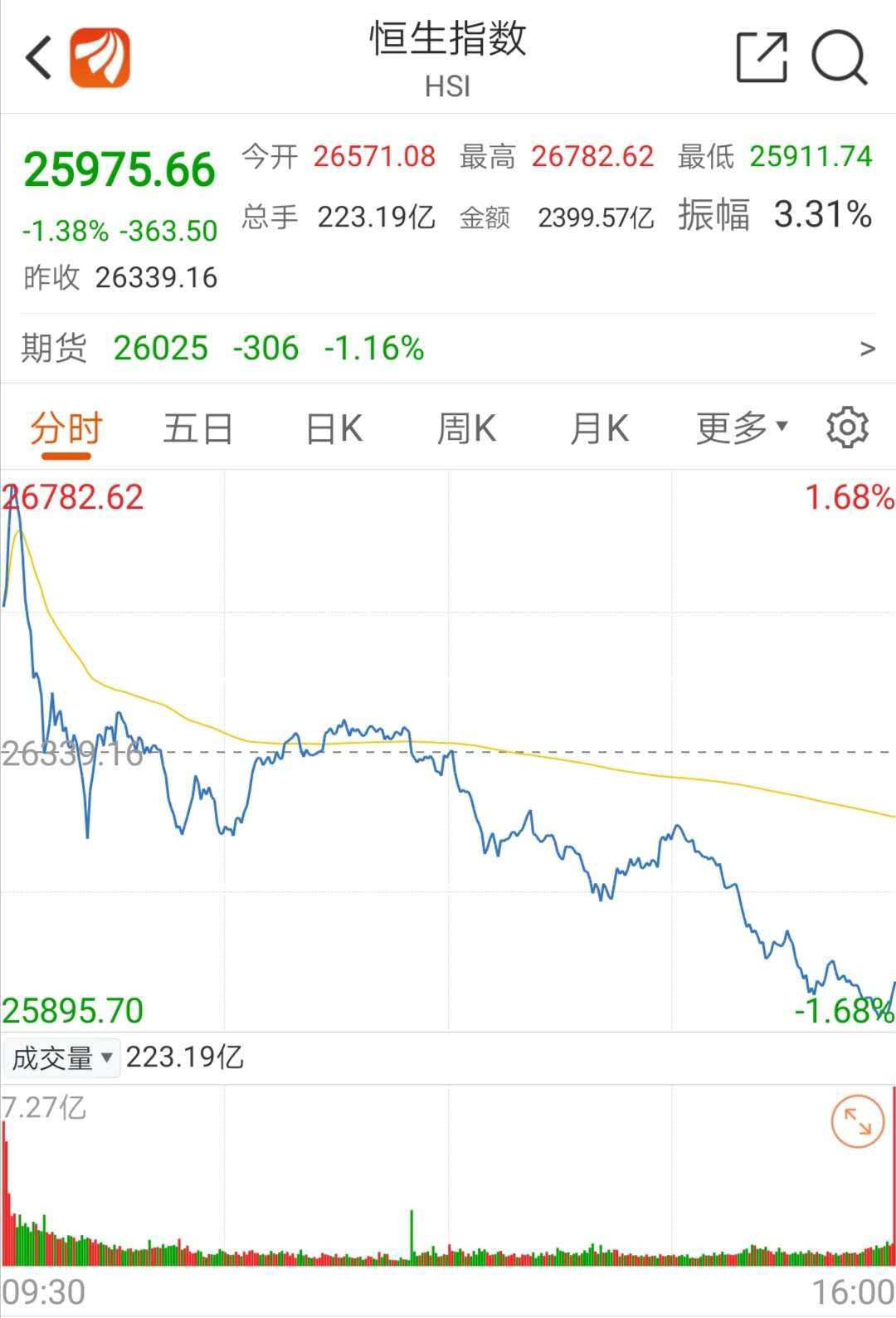 港股相较之下显得更加弱势。恒生指数在早盘大幅冲高后回落,尾盘甚至出现快速杀跌,至收盘,恒指跌幅为1.38%。