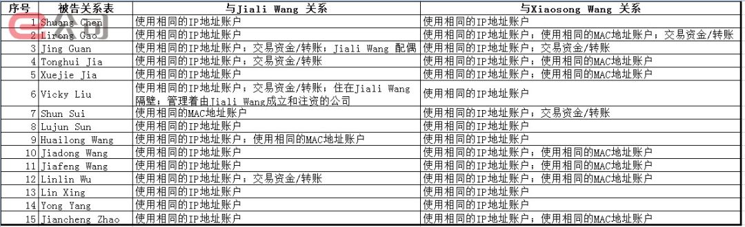 美国证券交易委员会表示,如下表所示,IP地址、电脑身份识别信息、银行转账记录均显示王佳立、王晓松和其他个人被告参与团伙作案。具体来看,下表所示每位被告名义下的账户所使用的IP或者MAC地址,都与王佳立、王晓松名义下账户有关联;在一些案例中,这些被告名义下的账户还与王佳立或王晓松名义下账户进行资金划拨。