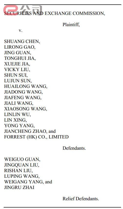 美国证券交易委员会提供的资料显示,18个交易商中,17名为自然人,剩余1家为注册在香港的企业。此外,还包括救济被告(Relief Defendants)6人。其中,美国马萨诸塞州地区检察官办公室宣布,对其中两名交易者——王佳立(Jiali Wang,音译)和王晓松(Xiaosong Wang,音译)提起公诉。