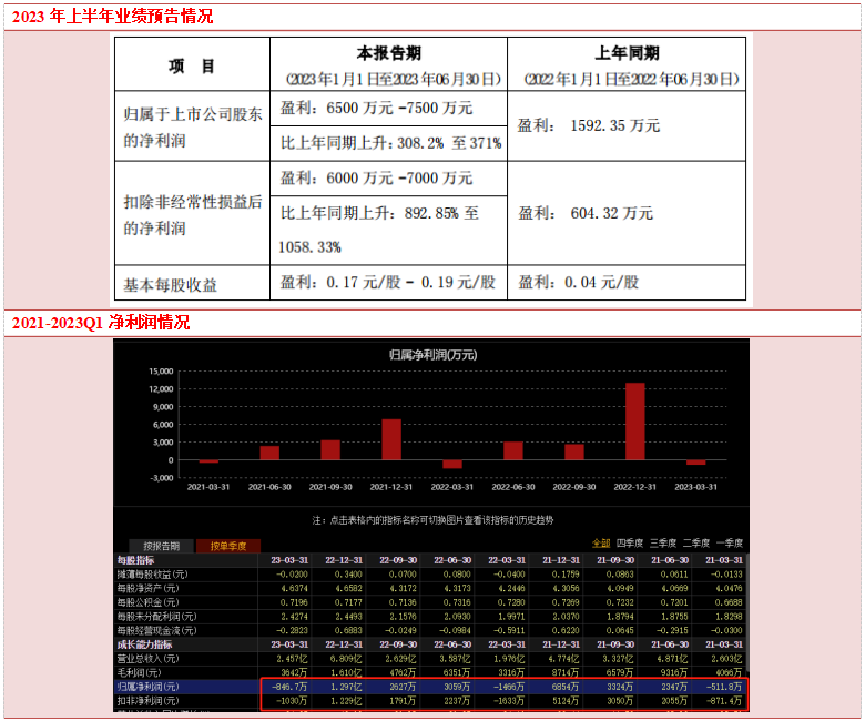 预计2023年半年度实现扣除非经常性损益后的净利润6000万元-7000万元同比增长892.85%至1058.33%。
