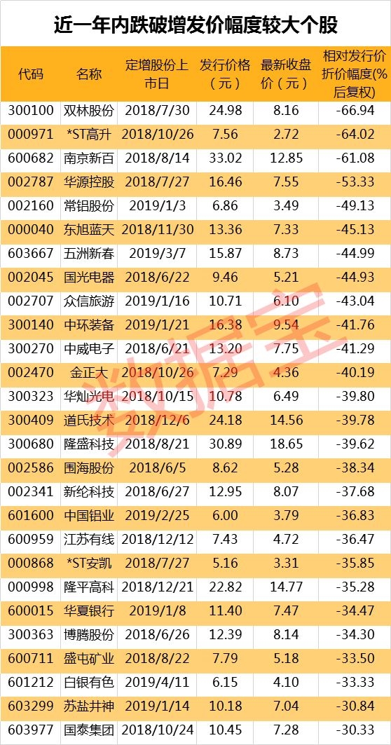 过去一年A股走势震荡,市场交易情绪一度低迷,上市公司定增融资的热情大幅减弱,增发实施次数同比减半,近半数定增个股已跌破增发价,27家公司参与定增的大股东和机构投资者已被套牢30%以上。近半数增发股跌破增发价,27股跌幅超30%从股价市场表现来看,近一年内实施定增的个股中有96股的最新收盘价跌破了增发价,占比47%,27股的最新价较发行价跌幅超过30%。双林股份较发行价跌幅达67%,折价幅度最高,*ST高升、南京新百和华源控股的跌幅位列其后,较增发价的折价幅度均超过50%。2018年年报显示,27只最新收盘价较增发价折价幅度超过30%的个股中,18股上年的扣非净利润同比下滑,12股下滑幅度超过50%,8股扣非净利润亏损。业绩大幅走弱是定增后股价走弱的最重要因素。