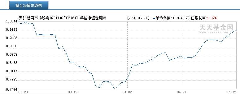 券商中国记者发现,截止5月21日最新披露的基金净值数据,天弘越南股票基金的净值为0.9743元,而在今年3月30日,天弘越南基金的净值甚至已跌到0.7474元,也就是说,短短两个月的时间内,天弘越南基金的净值一路暴涨的幅度超过30%。