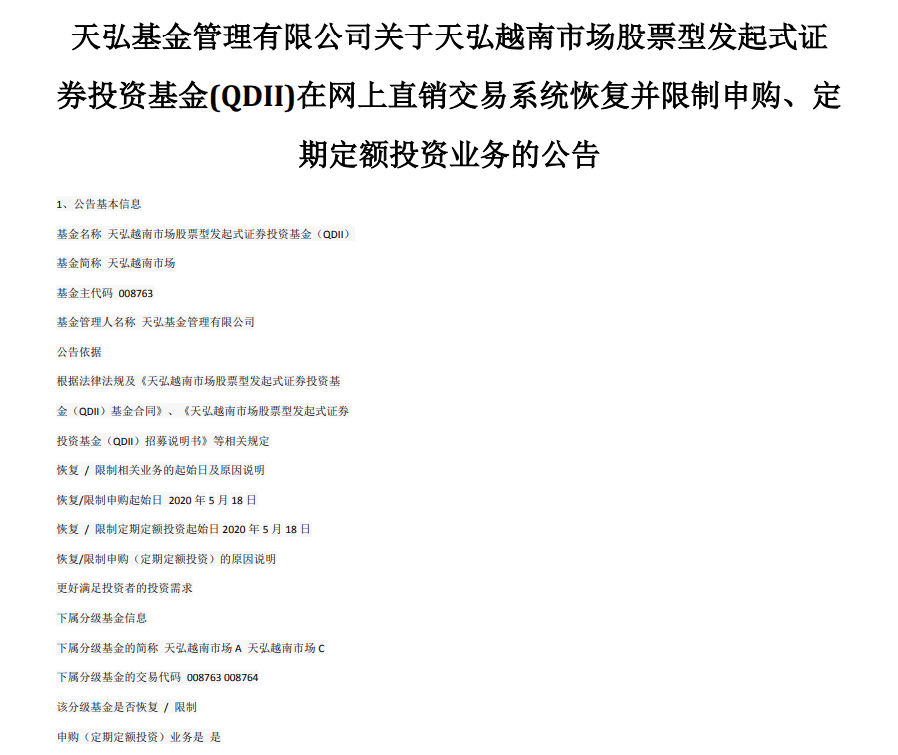 5月15日,天弘越南基金发布公告称,充分考虑外汇额度限制情况,以及为了更好满足投资者投资需求,公司决定自 2020 年 5 月 18 日起在网上直销交易系统暂停本基金单笔金额 1000 元以上(不含 1000 元)的申购(含定期定额投资,下同)业务申 请,且单个基金账户单日累计申购金额不得超过 1000 元(不含 1000 元),如单日累计申购金额超过 1000 元,公司有权部分或全部拒绝。