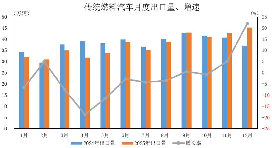 2025年12月,传统燃料汽车出口45.3万辆,环比增长6%,同比增长22%。