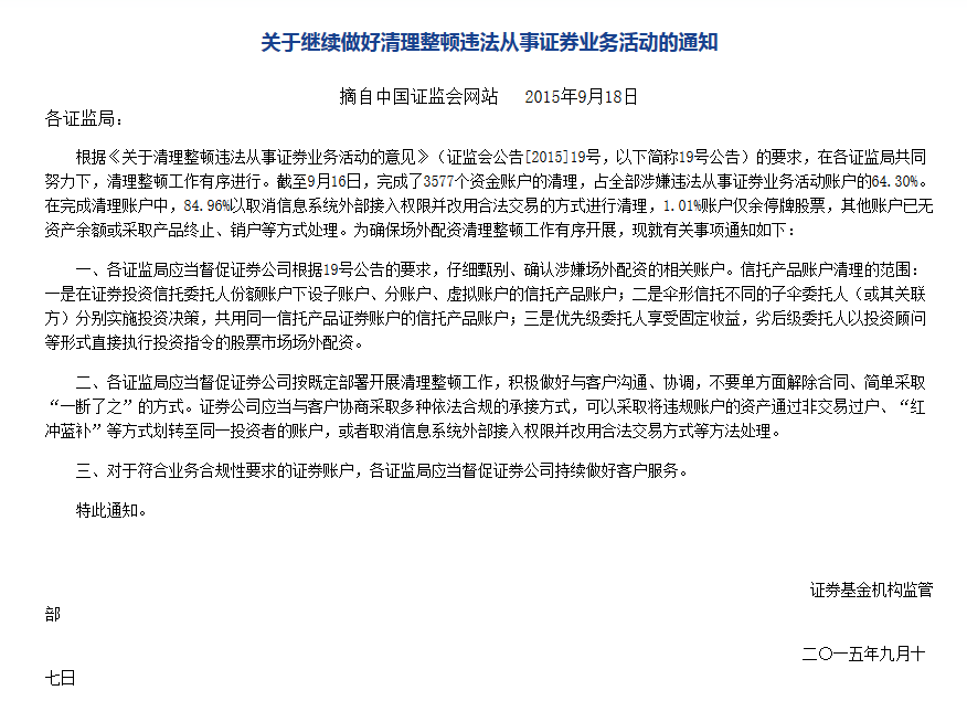 而至2015年7月,证监会官网挂出《关于清理整顿违法从事证券业务活动的意见》,载明证券公司应当严格审查交易账户及交易操作的合规性,严禁账户持有人通过证券账户下设子账户等方式违规进行证券交易。