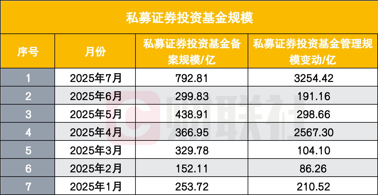 三是私募证券投资基金。该类资金同样表现突出,7月新增备案规模达792.81亿元,远超6月的299.83亿元,创下2022年以来新高,管理规模也新增3254亿元。