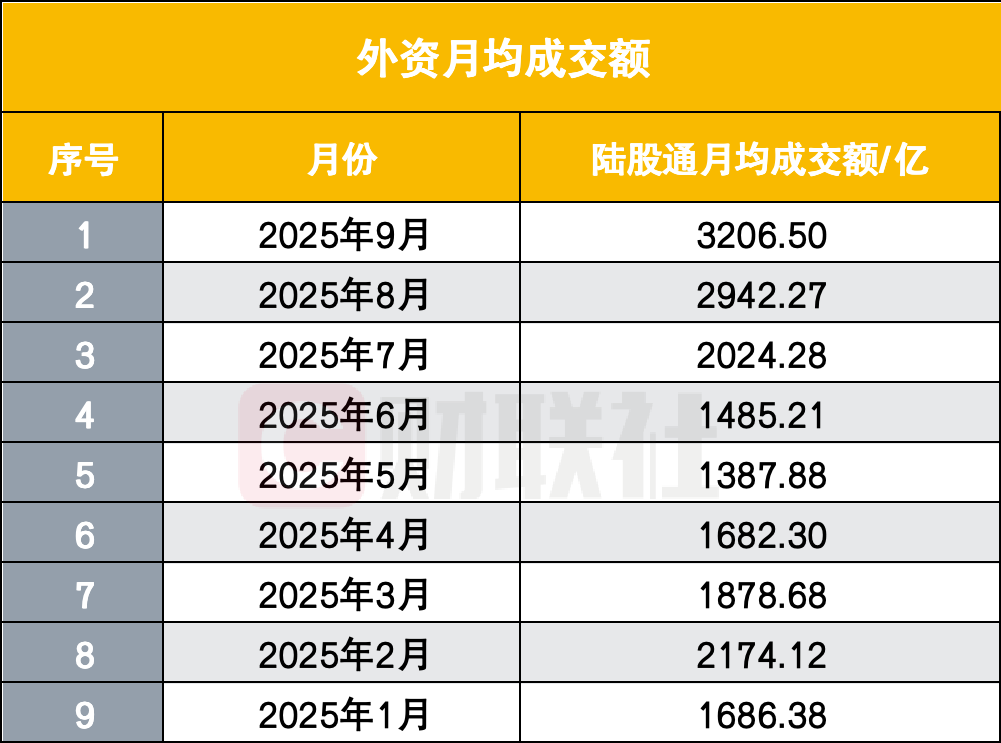 外资在8月也展现出显著的活跃迹象,成为A股市场增量资金的重要补充。数据显示,8月陆股通月均成交额达到2942.27亿元,较7月的2024.28亿元大幅增长45.8%,创下历史新高;而进入9月后,外资活跃度进一步提升,9月陆股通月均成交额攀升至3206.50亿元,较8月再增9%,延续了“量价齐升”的良好态势。
