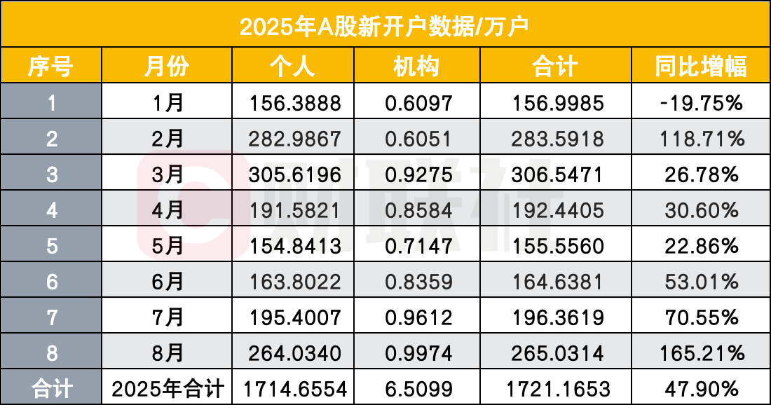 在机构资金与外资纷纷入场的背景下,个人投资者的市场参与热情也同步提升。尽管具体开户数据未完全披露,但从市场反馈与高频指标来看,8月投资者开户数同比增幅显著,新增投资者数量较去年同期实现大幅增长。个人投资者作为A股市场的重要参与群体,其开户数的增加意味着市场“散户基础”进一步巩固,叠加融资资金的加杠杆行为,共同推动A股市场交投活跃度提升。