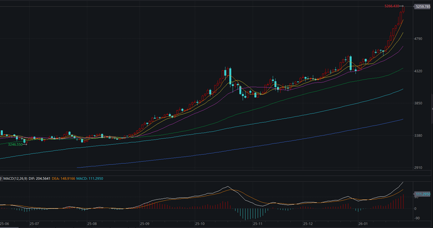 据wind统计数据,截至1月28日,现货黄金触及5266.43美元/盎司,自 2025年7月以来,已上涨59.48%;