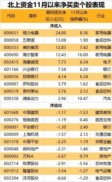 先从活跃股来看,39只上榜股中有26股获净买入,这26股平均上涨4.23%,仅3股小幅下跌;相比之下,13只净卖出股仅小幅上涨0.15%。举例来看,净买入24亿的格力电器11月以来股价上涨8.36%,净买入12.43亿元的海尔智家本月以来股价涨幅最高,达到16%。