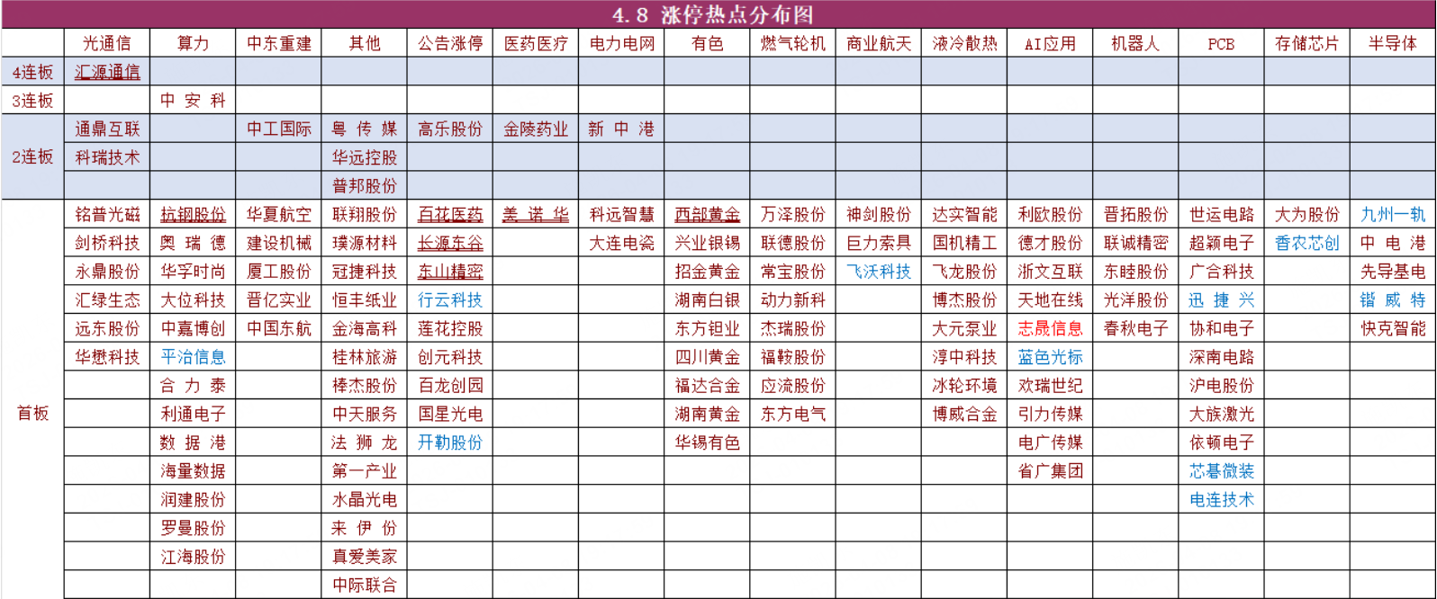 大光中际+新易盛历史新高带动了小光集体补涨,前期抗跌OCS波动小一些,毕竟一直再新高,超跌的弹性更大一些。光纤汇源通信继续顶板,周二盘前讲的通鼎互联2连板,昨天龙虎榜显示买一跟买四都是波段风格的游资席位,替代了高位的长飞光纤成了新的容量中军,昨晚康宁高开高走再创历史新高,低位的特发信息,华脉科技这种依旧形态不错。PCB是东山精密业绩超预期,看能不能模仿佰维存储走一波小趋势。国产方向V4呼之欲出,算力租赁掀起涨停潮,这2天盘前讲的华丰,华胜,奥瑞德,行云科技都是大涨甚至涨停,尤其是后面2个昨天的日内龙,今天继续享受高溢价。燃机是前面超跌了快30~40%,所以昨天早盘是最强的方向,中军杰瑞股份,日内龙常宝股份,应流股份,博盈特焊。ai应用这块属于超跌反弹,盘中有消息讲又有一个爆款应用出炉,背后是中国团队,所以应用跟着一起超跌反弹了一把,利欧股份+蓝色光标章盟主重拳出击。还有就是存储芯片这块是业绩加持的,晚上又出了2个业绩预增云汉跟香农芯创的公告,昨天盘面都给了正反馈,把前面德明利带的坑给填上了,后续只要这个方向出业绩对板块都是正面刺激。基本上科技回归的话,都是炒作这几个分支,说来说去还是那几个方向,那几个个股,领涨的来来回回也是那几个,前面大势不好,那会逻辑票都有错杀捡漏的机会,前面有把握到低吸的机会,这几天基本都是笑眯眯的,现在的话基本都只剩头铁的买点了。