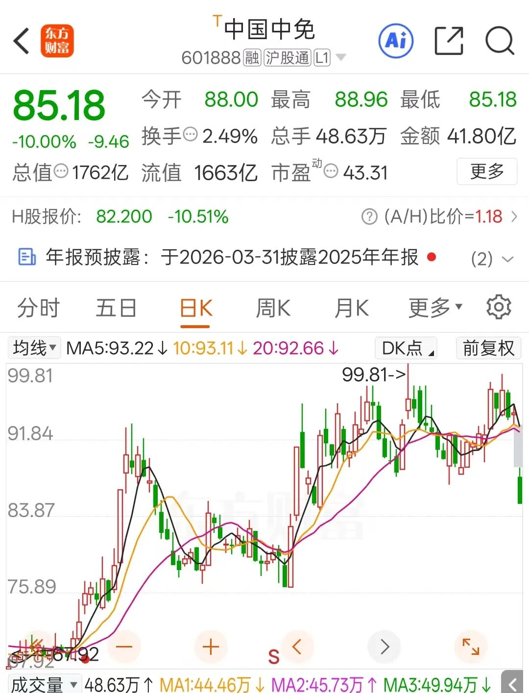 马年首个交易日,在沪深股指表现出色的背景下,“免税茅”中国中免低开低走,开盘后迅速封住跌停并维持到收盘,全天成交额为41.8亿元,截至收盘封单金额约为7.61亿元;港股方面,近三个交易日该公司跌幅亦超过22%。