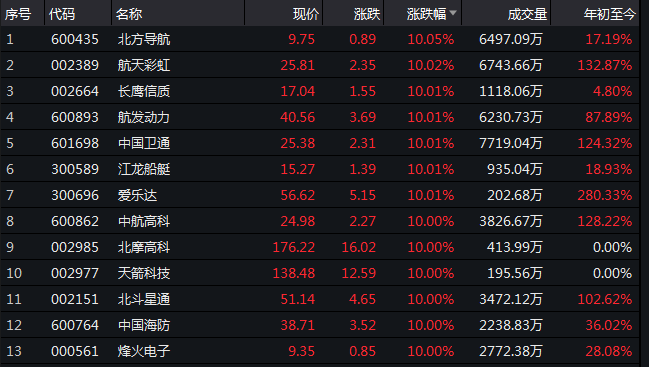 板块表现来看,国防军工板块涨幅超7%以上,遥遥领先其他板块;汽车、计算机、电子板块紧跟其后,涨幅超3%。国防军工板块内涨声一片,北方导航、航天彩虹、航发动力等超20股涨停。
