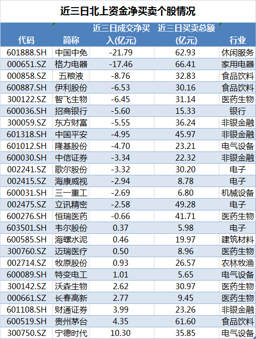 具体来看,近三个交易日,中国中免、格力电器、五粮液、伊利股份与智飞生物遭北上资金净卖出额居前,均超6亿元。