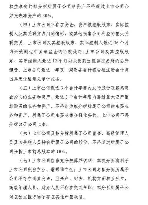 比如,为了限制企业无谓“造壳”,规则上要求上市公司最近3年已经进行过募资的业务和资产以及重大资产重组购买的业务和资产,不能作为子公司进行分拆。这样就防止了上市公司既享有原上市公司的上市红利,再继续分拆上市,占用资本市场资源。