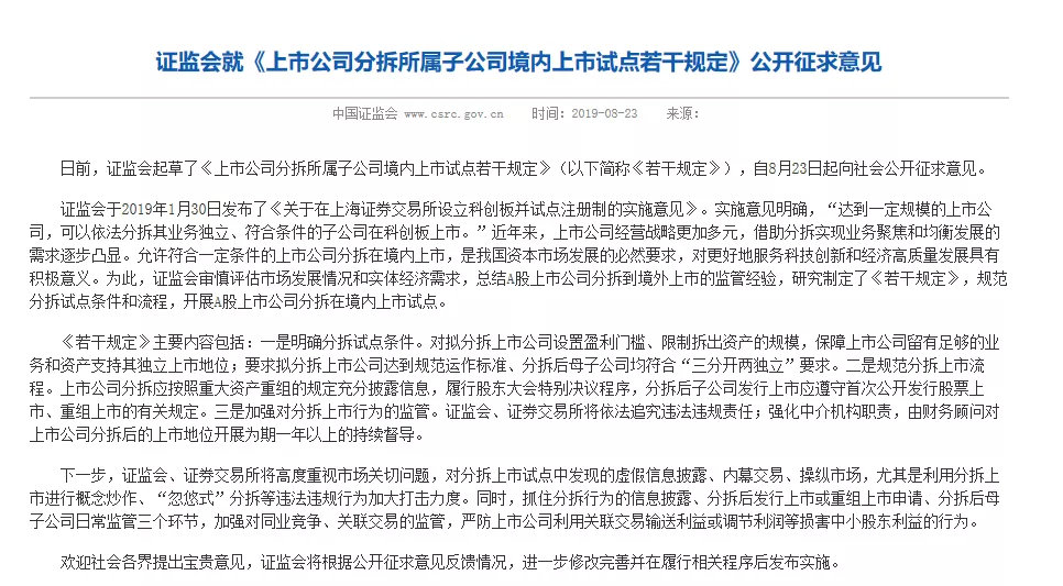 8月23日,证监会发布消息,证监会起草了《上市公司分拆所属子公司境内上市试点若干规定》(简称《规定》),并自8月23日起向社会公开征求意见。