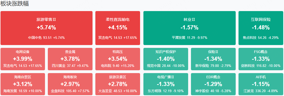 板块方面,电网设备、旅游酒店、机器人、海南自贸等板块表现活跃,CPO、AI应用、保险等板块表现落后。截至早盘收盘,沪指涨0.13%,深成指跌0.01%,创业板指跌0.64%。