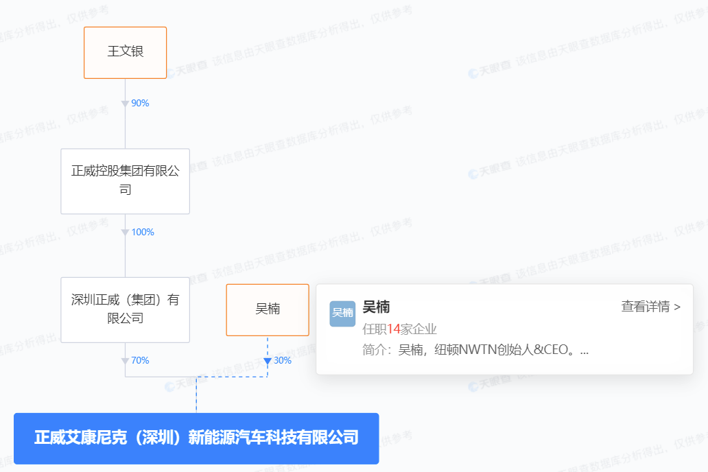 进一步往下扒,纽顿集团在没有迁往阿联酋之前,其前身天津艾康尼克公司,在2021年跟王文银的正威集团还联合成立过一家叫做“正威艾康尼克”的新能源汽车公司。