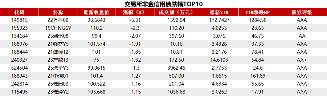 据Choice 数据统计显示,据Choice 数据统计显示,今日交易所市场非金信用债跌幅排行前五的分别是:22万科02、19CHNG6Y、25潮州08、21赣交Y5、21诚通12。具体如下: