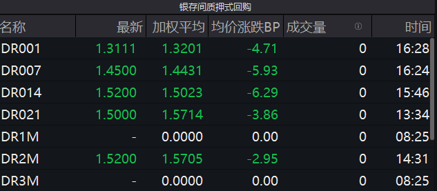 银银间回购定盘利率全线下跌。FDR001跌4.0个基点报1.33%;FDR007跌7.0个基点报1.42%;FDR014跌6.5个基点报1.49%。