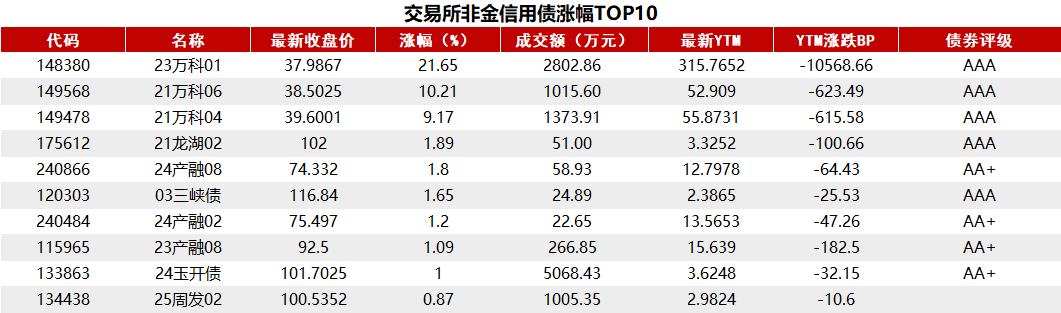 交易所债券市场收盘,据Choice 数据统计显示,今日交易所市场非金信用债涨幅排行前五的分别是:23万科01、21万科06、21万科04、21龙湖02、24产融08。具体如下: