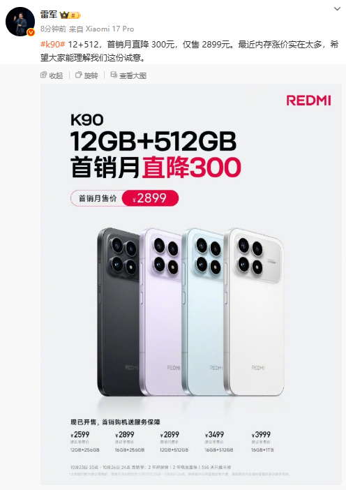 雷军今日早间在微博上发文回应小米K90手机定价问题。他表示,内存涨价太多,希望消费者能够理解小米公司的定价决策。