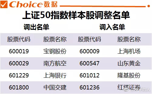 本次样本调整中,上证50指数更换4只股票,上海机场、山东黄金、隆基股份、红塔证券进入指数,包钢股份、上海银行、南方航空、中国交建被调出指数。