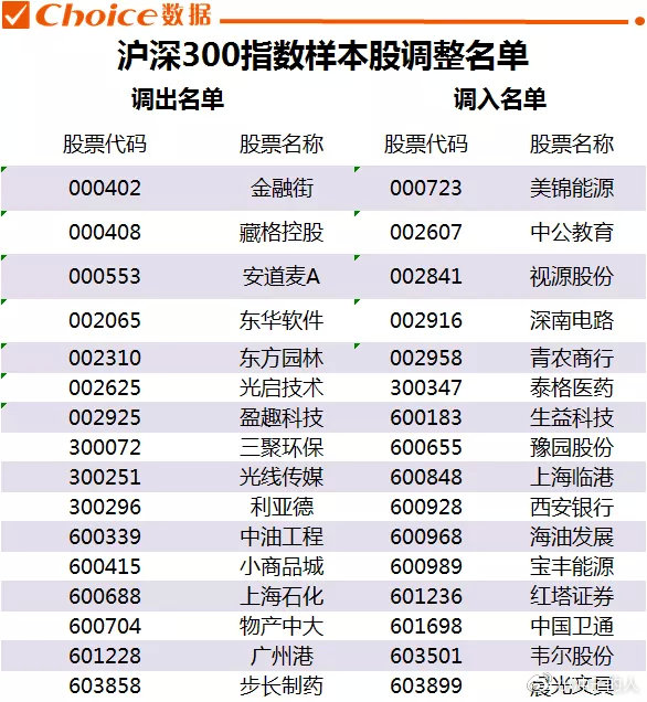 沪深300指数替换16只股票,中公教育、晨光文具等股票进入指数,光线传媒、东方园林等个股被调出指数。