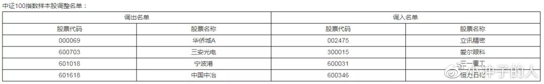 中证100指数更换4只股票,立讯精密、爱尔眼科等股票进入指数,三安光电、宁波港等被调出指数。