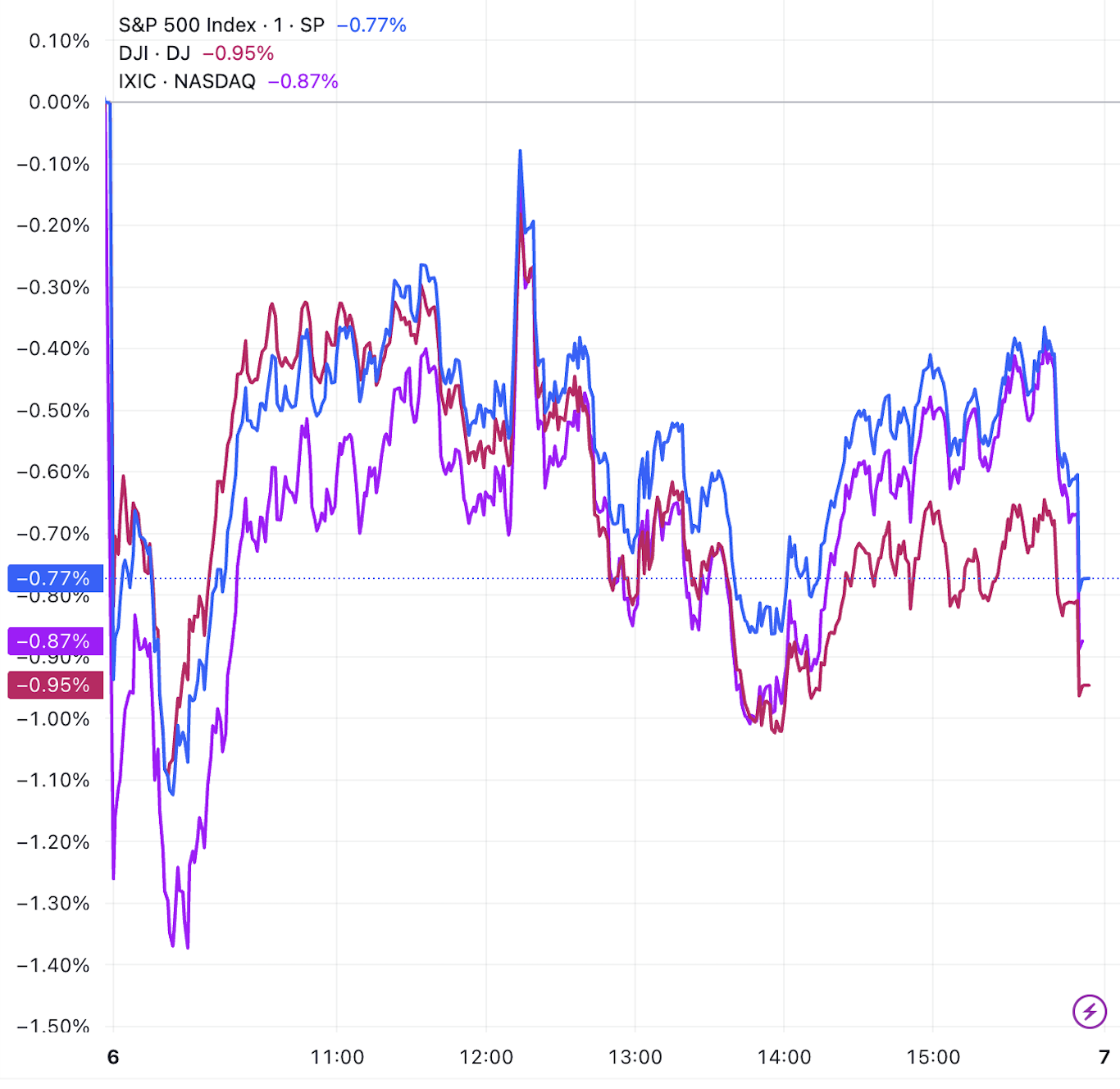 截至收盘,道琼斯指数跌0.95%,报40,829.00点;标普500指数跌0.77%,报5,606.91点;纳斯达克指数跌0.87%,报17,689.66点。