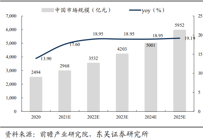 根据前瞻产业研究院数据,2020年国内传感器市场规模达2494亿人民币,2020-2025年CAGR预计达20.0%,国内传感器市场规模增速高于全球增速。