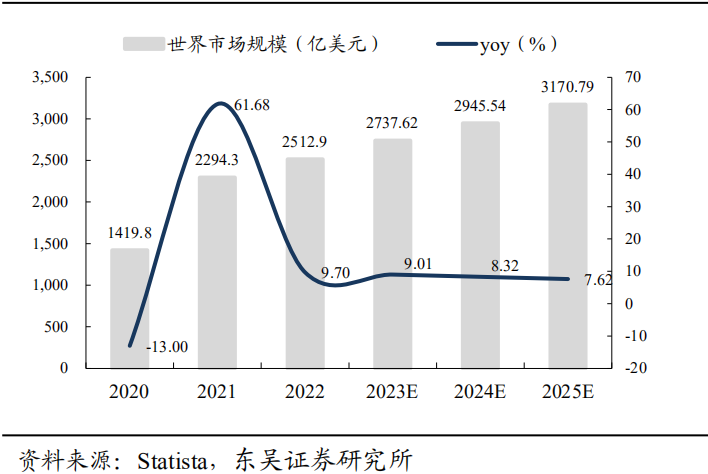随着近年来人工智能、物联网、5G等前沿科技的不断发展,传感器市场需求逐步增长。根据 Statista 数据,2022年全球传感器市场规模达2512.9亿美元,2022-2025年CAGR预计达8.04%,预计2025年全球传感器市场规模将超过3000亿美元。