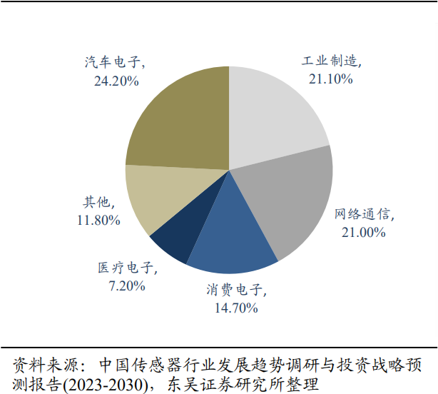 目前我国传感器在汽车电子、工业制造、网络通信、消费电子及医疗电子中应用较为广泛。其中传感器在汽车电子领域中占比最高,2020年占比达24.2%。