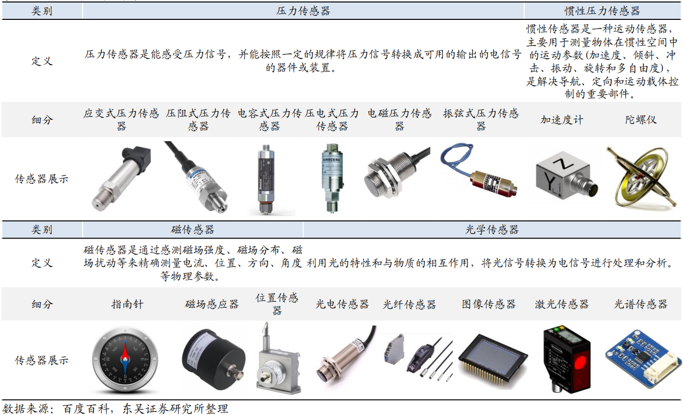 根据压力信号、物体在惯性空间的运动参数、磁场以及光合物质的相互作用,传感器可分为压力传感器、惯性传感器、磁传感器、光学传感器等