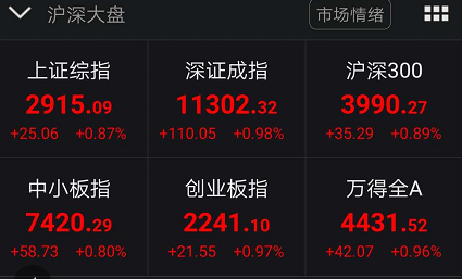 6月16日当天,A股三大指数集体高开,其中创业板指数大涨超1%以上。截至当日午盘收盘,沪指涨0.87%,报收2915点;深成指涨0.98%,报收11302点;创业板指涨0.97%,报收2241点。