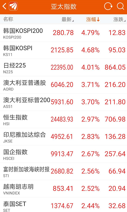 同时,印尼、新加坡、泰国、越南等多国主要股市指数均张超2%以上。