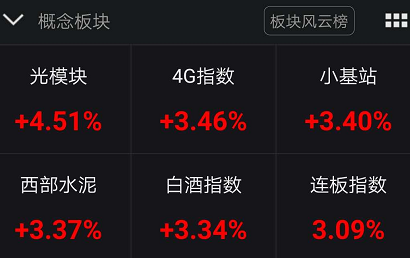 盘面上,光模块指数、小基站指数、4G指数集体领涨。同时,白酒指数、西部水泥指数表现也同样突出,两市热门题材多点开花。