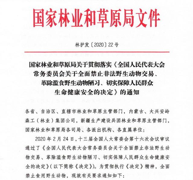国家林业和草原局今天(27日)印发《关于贯彻落实〈全国人民代表大会常务委员会关于全面禁止非法野生动物交易、革除滥食野生动物陋习、切实保障人民群众生命健康安全的决定〉的通知》,也关注到了这个问题。